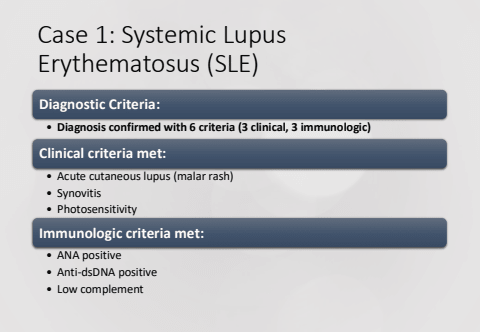 Case 1: Systemic Lupus Erythematosus (SLE)Diagnostic Criteria:%u2022 Diagnosis confirmed with 6 criteria (3 clinical, 3 immunologic)Clinical criteria met:%u2022 Acute cutaneous lupus (malar rash)%u2022 Synovitis%u2022 PhotosensitivityImmunologic criteria met:%u2022 ANA positive%u2022 Anti-dsDNA positive%u2022 Low complement