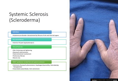 Systemic Sclerosis (Scleroderma)%u2022Autoimmune disorder characterized by fibrosis of skin and internal organsDefinition:%u2022Anti-Scl-70 (anti-topoisomerase I)Key autoantibody:%u2022Skin thickening and tightening%u2022Raynaud's phenomenon%u2022Gastrointestinal involvement%u2022Pulmonary fibrosis%u2022Renal crisisClinical features:%u2022Calcinosis, Raynaud's phenomenon, Esophageal dysmotility, Sclerodactyly, Telangiectasia%u2022Associated autoantibody: Anti-centromereCREST syndrome: Limited form of systemic sclerosisThis Photo by Unknown Author is licensed under CC BY-SA