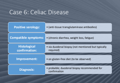 Case 6: Celiac DiseasePositive serology: %u2022 (anti-tissue transglutaminase antibodies)Compatible symptoms: %u2022 (chronic diarrhea, weight loss, fatigue)%u2022 via duodenal biopsy (not mentioned but typically required)Histological confirmation:Improvement: %u2022 on gluten-free diet (to be observed)%u2022 probable; duodenal biopsy recommended for confirmation Diagnosis: