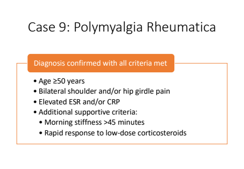 Case 9: Polymyalgia Rheumatica%u2022 Age %u226550 years%u2022 Bilateral shoulder and/or hip girdle pain%u2022 Elevated ESR and/or CRP%u2022 Additional supportive criteria:%u2022 Morning stiffness >45 minutes%u2022 Rapid response to low-dose corticosteroidsDiagnosis confirmed with all criteria met