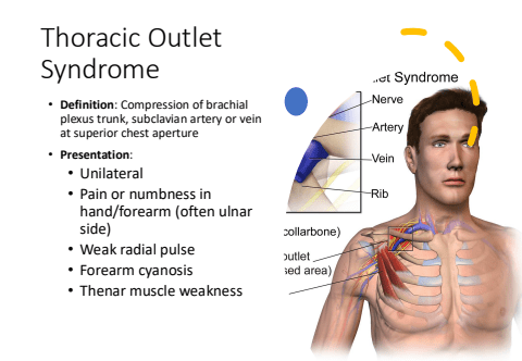 Thoracic Outlet Syndrome%u2022 Definition: Compression of brachial plexus trunk, subclavian artery or vein at superior chest aperture%u2022 Presentation:%u2022 Unilateral%u2022 Pain or numbness in hand/forearm (often ulnar side)%u2022 Weak radial pulse%u2022 Forearm cyanosis%u2022 Thenar muscle weakness