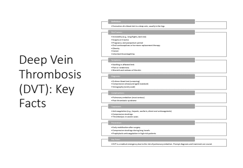 Deep Vein Thrombosis (DVT): Key Facts%u2022 Formation of a blood clot in a deep vein, usually in the legsDefinition:%u2022 Immobility (e.g., long flights, bed rest)%u2022 Surgery or trauma%u2022 Pregnancy and postpartum period%u2022 Oral contraceptives or hormone replacement therapy%u2022 Obesity%u2022 Cancer%u2022 Inherited thrombophiliasRisk Factors:%u2022 Swelling in affected limb%u2022 Pain or tenderness%u2022 Warmth and redness of the skinSymptoms:%u2022 D-dimer blood test (screening)%u2022 Compression ultrasound (gold standard)%u2022 Venography (rarely used)Diagnosis:%u2022 Pulmonary embolism (most serious)%u2022 Post-thrombotic syndromeComplications:%u2022 Anticoagulation (e.g., heparin, warfarin, direct oral anticoagulants)%u2022 Compression stockings%u2022 Thrombolysis in severe casesTreatment:%u2022 Early mobilization after surgery%u2022 Compression stockings during long travels%u2022 Prophylactic anticoagulation in high-risk patientsPrevention:%u2022 DVT is a medical emergency due to the risk of pulmonary embolism. Prompt diagnosis and treatment are crucial.Key Point: