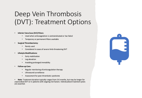 Deep Vein Thrombosis (DVT): Treatment Options%u2022 Inferior Vena Cava (IVC) Filters:%u2022 Used when anticoagulation is contraindicated or has failed%u2022 Temporary or permanent filters available%u2022 Surgical Thrombectomy:%u2022 Rarely used%u2022 Considered in cases of severe limb-threatening DVT%u2022 Lifestyle Modifications:%u2022 Early mobilization%u2022 Leg elevation%u2022 Avoiding prolonged immobility%u2022 Follow-up Care:%u2022 Regular monitoring of anticoagulation therapy%u2022 Ultrasound surveillance%u2022 Assessment for post-thrombotic syndrome%u2022 Note: Treatment duration typically ranges from 3-6 months, but may be longer for unprovoked DVT or in patients with ongoing risk factors. Individualized treatment plans are essential.