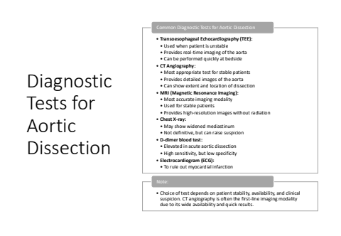 Diagnostic Tests for Aortic Dissection%u2022 Transoesophageal Echocardiography (TEE):%u2022 Used when patient is unstable%u2022 Provides real-time imaging of the aorta%u2022 Can be performed quickly at bedside%u2022 CT Angiography:%u2022 Most appropriate test for stable patients%u2022 Provides detailed images of the aorta%u2022 Can show extent and location of dissection%u2022 MRI (Magnetic Resonance Imaging):%u2022 Most accurate imaging modality%u2022 Used for stable patients%u2022 Provides high-resolution images without radiation%u2022 Chest X-ray:%u2022 May show widened mediastinum%u2022 Not definitive, but can raise suspicion%u2022 D-dimer blood test:%u2022 Elevated in acute aortic dissection%u2022 High sensitivity, but low specificity%u2022 Electrocardiogram (ECG):%u2022 To rule out myocardial infarctionCommon Diagnostic Tests for Aortic Dissection%u2022 Choice of test depends on patient stability, availability, and clinical suspicion. CT angiography is often the first-line imaging modality due to its wide availability and quick results.Note: