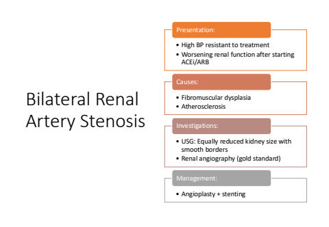Bilateral Renal Artery Stenosis%u2022 High BP resistant to treatment%u2022 Worsening renal function after starting ACEi/ARBPresentation:%u2022 Fibromuscular dysplasia%u2022 AtherosclerosisCauses:%u2022 USG: Equally reduced kidney size with smooth borders%u2022 Renal angiography (gold standard)Investigations:%u2022 Angioplasty + stentingManagement:
