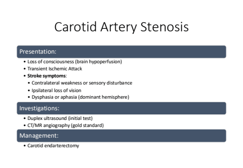 Carotid Artery StenosisPresentation:%u2022 Loss of consciousness (brain hypoperfusion)%u2022 Transient Ischemic Attack%u2022 Stroke symptoms:%u2022 Contralateral weakness or sensory disturbance%u2022 Ipsilateral loss of vision%u2022 Dysphasia or aphasia (dominant hemisphere)Investigations:%u2022 Duplex ultrasound (initial test)%u2022 CT/MR angiography (gold standard)Management:%u2022 Carotid endarterectomy