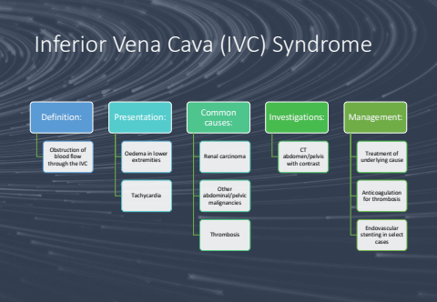 Inferior Vena Cava (IVC) SyndromeDefinition:Obstruction of blood flow through the IVCPresentation:Oedema in lower extremitiesTachycardiaCommon causes:Renal carcinomaOther abdominal/pelvic malignanciesThrombosisInvestigations:CT abdomen/pelvis with contrastManagement:Treatment of underlying causeAnticoagulation for thrombosisEndovascular stenting in select cases