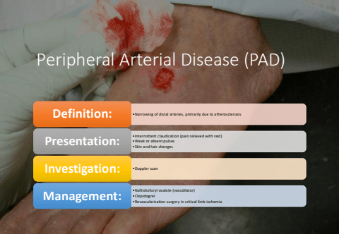Peripheral Arterial Disease (PAD)Definition: %u2022Narrowing of distal arteries, primarily due to atherosclerosis%u2022Intermittent claudication (pain relieved with rest)%u2022Weak or absent pulses Presentation:%u2022Skin and hair changes%u2022Doppler scan Investigation:%u2022Naftidrofuryl oxalate (vasodilator)%u2022Clopidogrel Management:%u2022Revascularisation surgery in critical limb ischemia