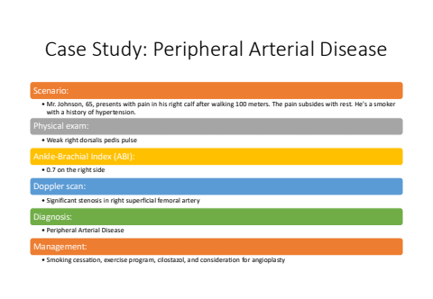 Case Study: Peripheral Arterial DiseaseScenario:%u2022 Mr. Johnson, 65, presents with pain in his right calf after walking 100 meters. The pain subsides with rest. He's a smoker with a history of hypertension.Physical exam:%u2022 Weak right dorsalis pedis pulseAnkle-Brachial Index (ABI):%u2022 0.7 on the right sideDoppler scan:%u2022 Significant stenosis in right superficial femoral arteryDiagnosis:%u2022 Peripheral Arterial DiseaseManagement:%u2022 Smoking cessation, exercise program, cilostazol, and consideration for angioplasty