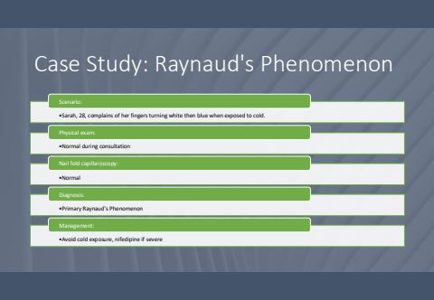 Case Study: Raynaud's Phenomenon%u2022Sarah, 28, complains of her fingers turning white then blue when exposed to cold.Scenario:%u2022Normal during consultationPhysical exam:%u2022NormalNail fold capillaroscopy:%u2022Primary Raynaud's PhenomenonDiagnosis:%u2022Avoid cold exposure, nifedipine if severeManagement: