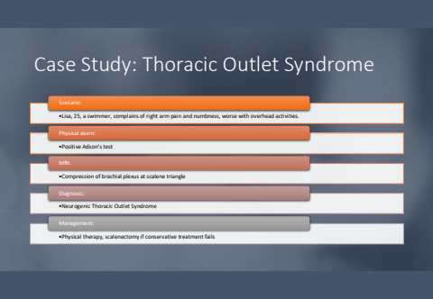 Case Study: Thoracic Outlet Syndrome%u2022Lisa, 25, a swimmer, complains of right arm pain and numbness, worse with overhead activities.Scenario:%u2022Positive Adson's testPhysical exam:%u2022Compression of brachial plexus at scalene triangleMRI:%u2022Neurogenic Thoracic Outlet SyndromeDiagnosis:%u2022Physical therapy, scalenectomy if conservative treatment failsManagement: