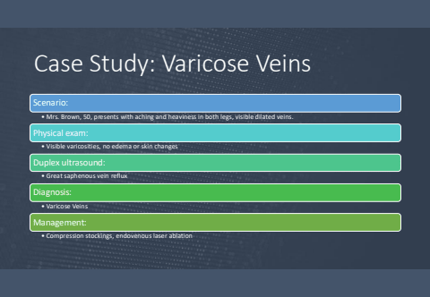 Case Study: Varicose VeinsScenario:%u2022 Mrs. Brown, 50, presents with aching and heaviness in both legs, visible dilated veins.Physical exam:%u2022 Visible varicosities, no edema or skin changesDuplex ultrasound:%u2022 Great saphenous vein refluxDiagnosis:%u2022 Varicose VeinsManagement:%u2022 Compression stockings, endovenous laser ablation