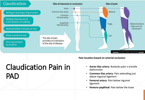 Claudication Pain in PADPain location based on arterial occlusion:%u2022 Aorto-iliac artery: Buttocks pain %u00b1 erectile dysfunction%u2022 Common iliac artery: Pain extending just above inguinal ligament%u2022 Femoral artery: Pain below inguinal ligament%u2022 Femoro-popliteal: Pain below the kneeThis Photo by Unknown Author is licensed under CC BY-NC