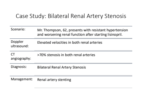 Case Study: Bilateral Renal Artery StenosisScenario: Mr. Thompson, 62, presents with resistant hypertension and worsening renal function after starting lisinopril.Doppler ultrasound:Elevated velocities in both renal arteriesCT angiography:>70% stenosis in both renal arteriesDiagnosis: Bilateral Renal Artery StenosisManagement: Renal artery stenting