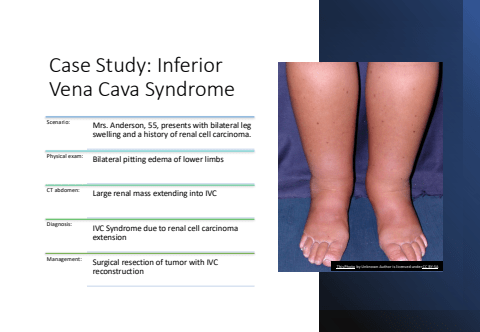 Case Study: Inferior Vena Cava SyndromeScenario: Mrs. Anderson, 55, presents with bilateral leg swelling and a history of renal cell carcinoma.Physical exam: Bilateral pitting edema of lower limbsCT abdomen: Large renal mass extending into IVCDiagnosis: IVC Syndrome due to renal cell carcinoma extensionManagement: Surgical resection of tumor with IVC reconstructionThis Photo by Unknown Author is licensed under CC BY-SA