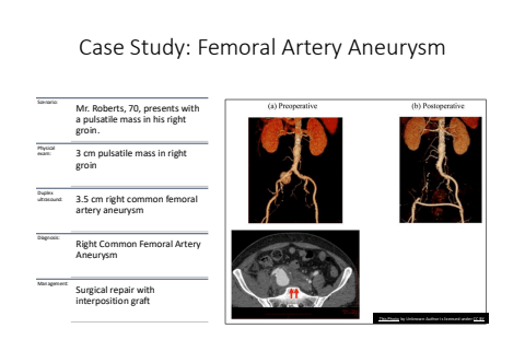 Case Study: Femoral Artery AneurysmScenario:Mr. Roberts, 70, presents with a pulsatile mass in his right groin.Physical exam: 3 cm pulsatile mass in right groinDuplex ultrasound: 3.5 cm right common femoral artery aneurysmDiagnosis:Right Common Femoral Artery AneurysmManagement:Surgical repair with interposition graftThis Photo by Unknown Author is licensed under CC BY