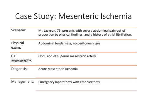 Case Study: Mesenteric IschemiaScenario: Mr. Jackson, 75, presents with severe abdominal pain out of proportion to physical findings, and a history of atrial fibrillation.Physical exam:Abdominal tenderness, no peritoneal signsCT angiography:Occlusion of superior mesenteric arteryDiagnosis: Acute Mesenteric IschemiaManagement: Emergency laparotomy with embolectomy