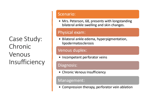 Case Study: Chronic Venous InsufficiencyScenario:%u2022 Mrs. Peterson, 68, presents with longstanding bilateral ankle swelling and skin changes.Physical exam:%u2022 Bilateral ankle edema, hyperpigmentation, lipodermatosclerosisVenous duplex:%u2022 Incompetent perforator veinsDiagnosis:%u2022 Chronic Venous InsufficiencyManagement:%u2022 Compression therapy, perforator vein ablation